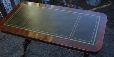 Desks with leather inserts are often so worn and faded that replacement is cheaper and better looking than a restoration. The shop has an assortment of brass rolls to emboss the leather either with gold or blind (blackened). Very little leather is kept in stock but is purchased to order.