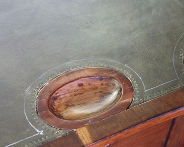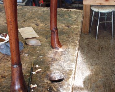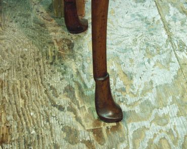 A Queen Anne card table with unusual feet came into my shop needing complete restoration from repairing extensive veneer losses to restoring the original height to both back legs. Every attempt was made to keep the original material and shape intact. The additions were spliced on to existing surfaces with epoxy with hide glue as a barrier coating to allow for future retreatment.The new wood was carefully carved to match the existing profile. Tooled leather was substituted for the typical felt playing surface and the finished surfaces were cleaned and polished with French polish (shellac applied with a pad).