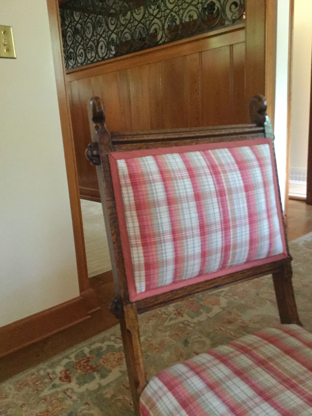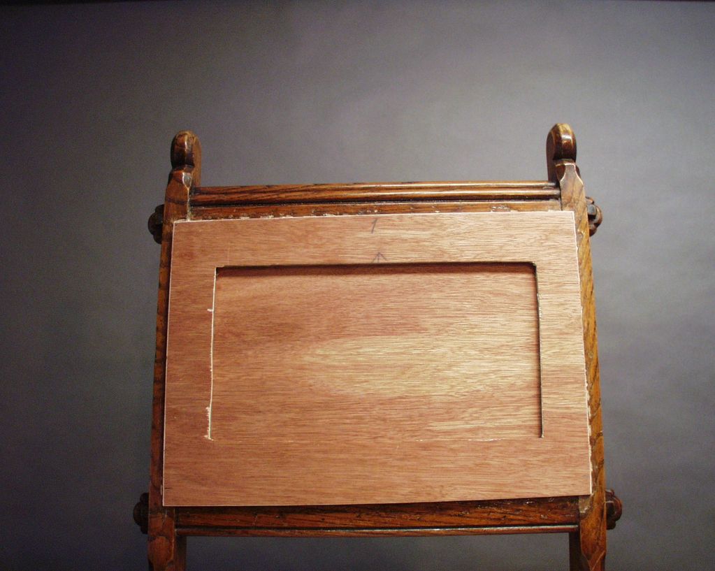 This Arts-and Crafts side chair had been reupholstered so many times that the client and I decided to make an insert or squab that would hold all the foundation and material. This squab was made to fit into the frame. A shallow recess provided a place for extra cushioning. It was then covered in canvas so the show material could be sewn onto it.