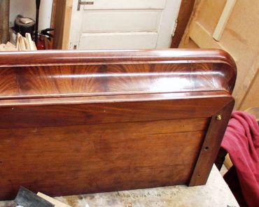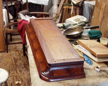 The moldings were then cut to size and assembled onto what remained of the original cornice. Solid mahogany was used for the small cockbead molding, the top molding, and the corners. These exquisite veneers and solid pieces of mahogany were some of my finest mahogany that were waiting for "just the right job."