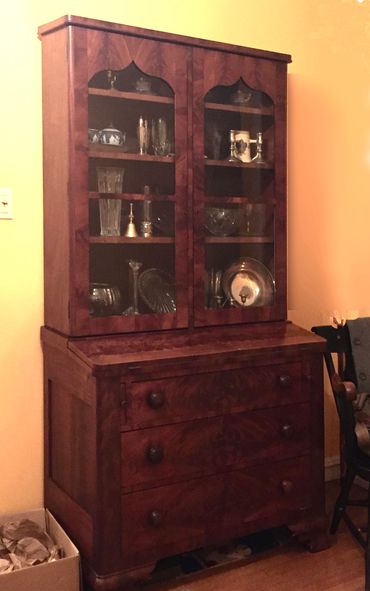 This before-and-after set of photos shows the fabrication of a crown molding to compensate for a loss that occurred many years ago. The owner had enjoyed this piece in her youth and never remembers anything different than from the "before" picture. Close inspection showed the vestiges of glue lines and miters, though most anyone familiar with the form would notice the loss. After research of various other Empire secretaries, this design was chosen which adds the missing molding while preserving what's left of the original cornice.