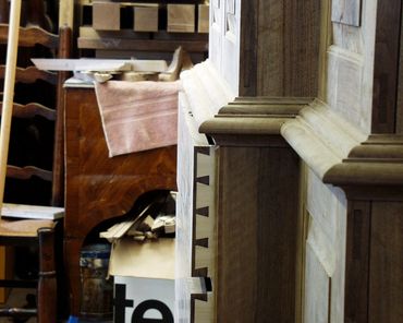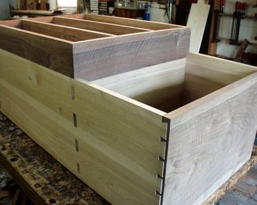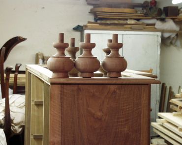 In the fall of 2008 I was commissioned to make a wardrobe for a dressing room. The following photographs show the techniques employed to make a wardrobe in the William and Mary style. This is a style that dates in America from 1690 - 1720, a style that continues past the reign of William III of Great Britain. On English furniture the style is marked by the use of cross-grain veneers and inlay. It is a robust style with large moldings and turned feet. Walnut was the predominant wood used to make furniture of this period in both England and America. In America, however, the abundance of large walnut trees as well as most other species allowed cabinetmakers to use solid lumber rather than veneer. Secondary woods were used in greater thicknesses than in their European counterparts.