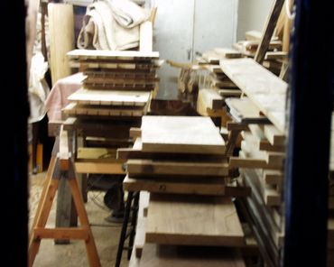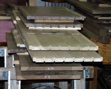 This wardrobe is made from Pennsylvania black walnut. Paul Kise of Good Hope Hardwoods told me that the trunk was over four feet in diameter and that before it had been cut, it produced few walnuts but those it did produce were the size of apples. The two flitches were from two main branches from this trunk and were over 22 inches in diameter. All the boards exhibited some curl and the center boards had nice crotch figure. These were to be the door panels.