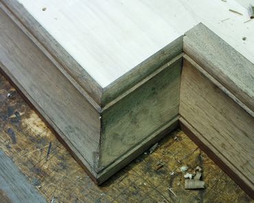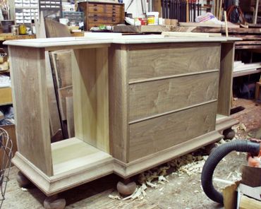 The case is composed of seven elements: the base which is comprised of a molding platform supported by eight feet; the bottom case which houses the three center drawers and two small side cabinets; the waist mold which is a series of stacked moldings on a frame; three top cabinets which are tied together by the waist mold and; the cornice, again a series of stacked moldings. Most all moldings are made using hand planes.